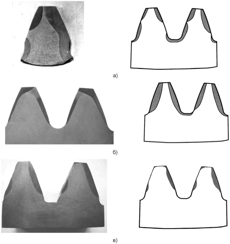 Недостаточная толщина или разрыв закаленного слоя на активной поверхности а) или во впадине зуба при контурной закалке б), при секторной закалке на активной поверхности в).