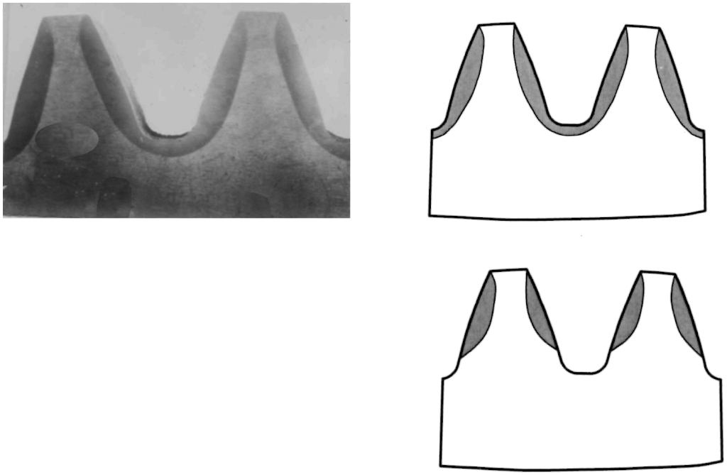 | Недостаточная толщина или разрыв упрочненного слоя на активной поверхности или во впадине зуба при контурной закалке | Неудовлетворительная |
