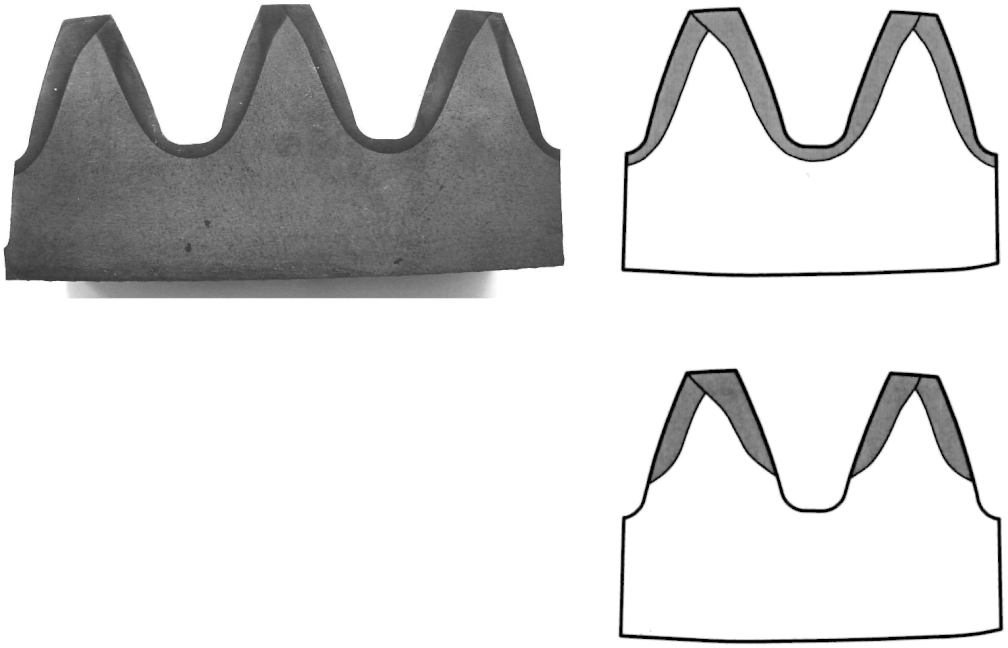 Перекрытие слоев по всей вершине зуба без выхода на активную поверхность, наличие светлых пятен в упрочненном слое.