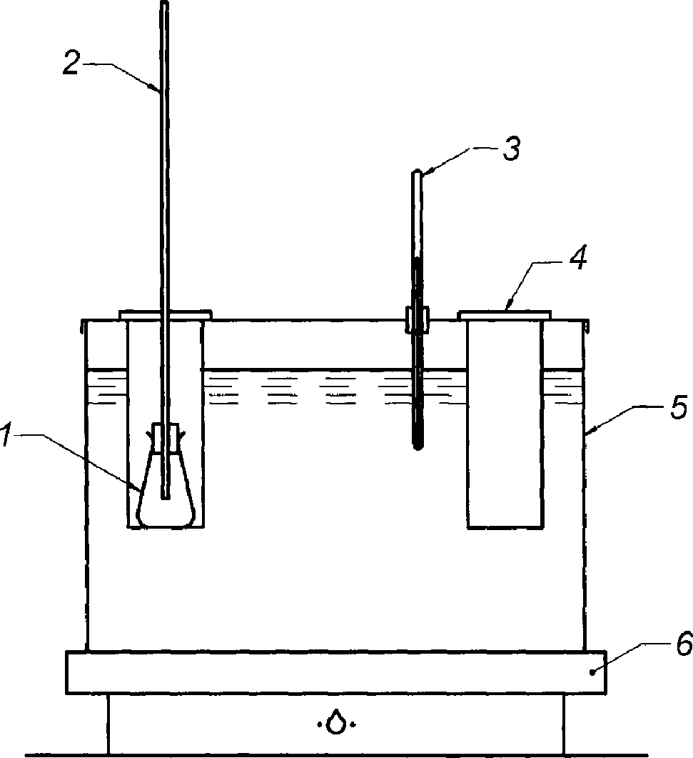 8.3.2 Смесь образца с гексадеканом переливают в чистую колбу вместимостью 50 см3 и с помощью корковой пробки подсоединяют к ней конденсаторную трубку. Помещают колбу в масляную баню при температуре (100,0 +/- 0,5) °C и выдерживают (60 +/- 2) мин.