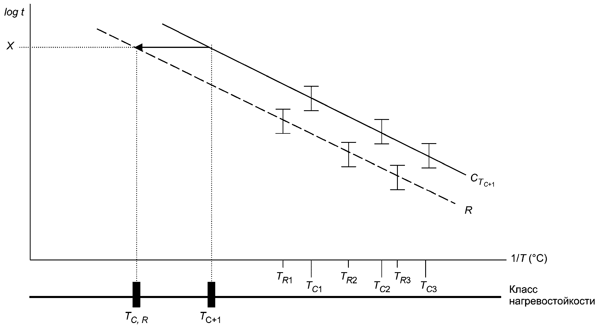 Рисунок 3 демонстрирует пример испытуемой системы, представленной для аттестации для такого же прогнозируемого срока эксплуатации и для следующего (более высокого) класса нагревостойкости, где доверительный интервал испытуемой системы, испытанный при помощи циклов нагрева при температурах для более высокого класса нагревостойкости, сдвинут к температуре класса нагревостойкости эталонной системы. Когда сдвиг по горизонтальной оси завершен, доверительные интервалы перекрывают или превышают интервалы эталонной системы. TC,R является классом нагревостойкости эталонной системы, а TC+1 - прогнозируемым классом нагревостойкости испытуемой системы.