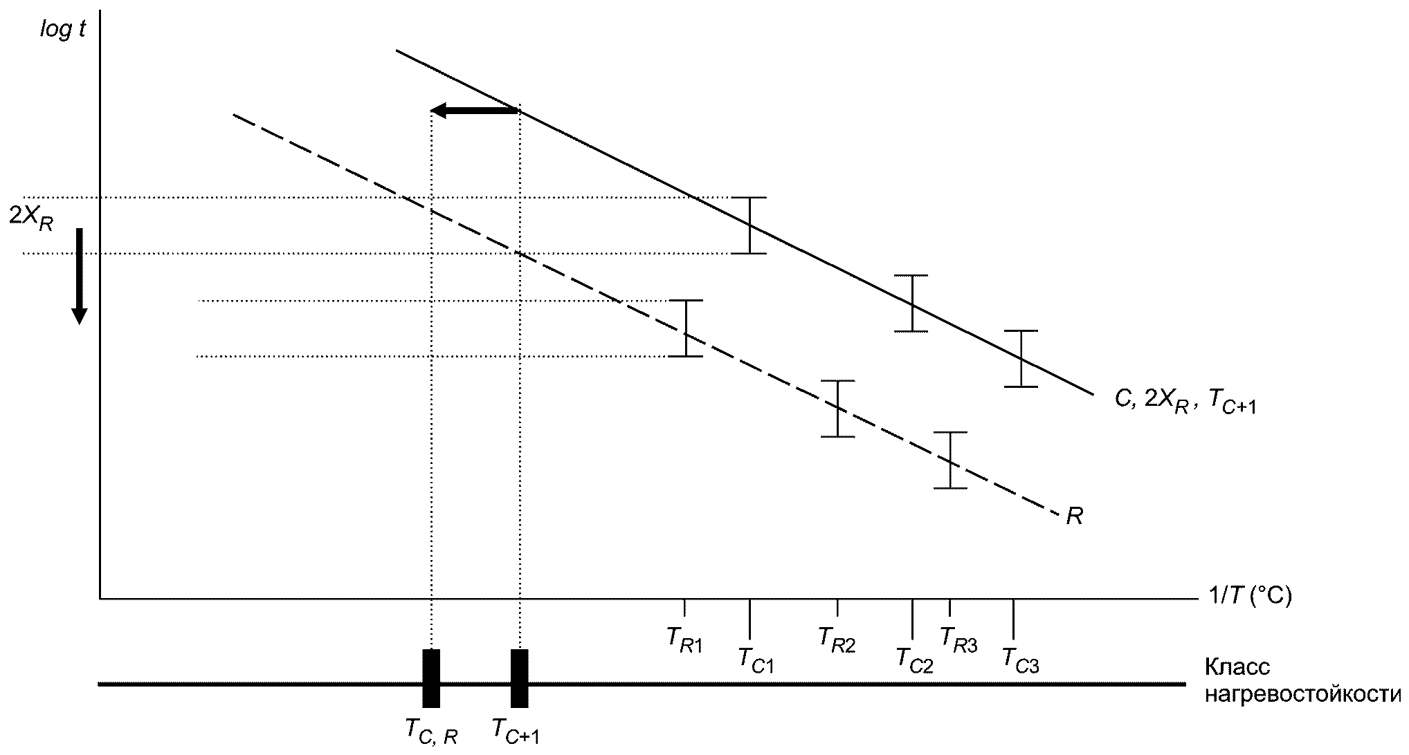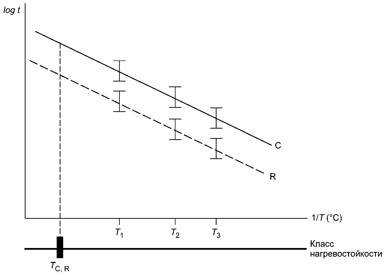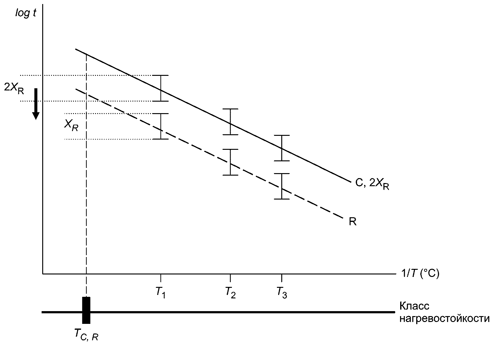 Рисунок 2 демонстрирует пример испытуемой системы, представленной для аттестации для такого же класса нагревостойкости и вдвое большего прогнозируемого срока эксплуатации по сравнению с эталонной системой. Когда вся линия испытуемой системы сдвинется вниз пропорционально множителю 2, ее 90%-ные доверительные интервалы перекроют интервалы эталонной системы. Для наглядности сдвиг по вертикальной оси показан только для доверительного интервала при одном значении температуры, T1. Следует обратить внимание, что TC,R показывает класс нагревостойкости эталонной системы.