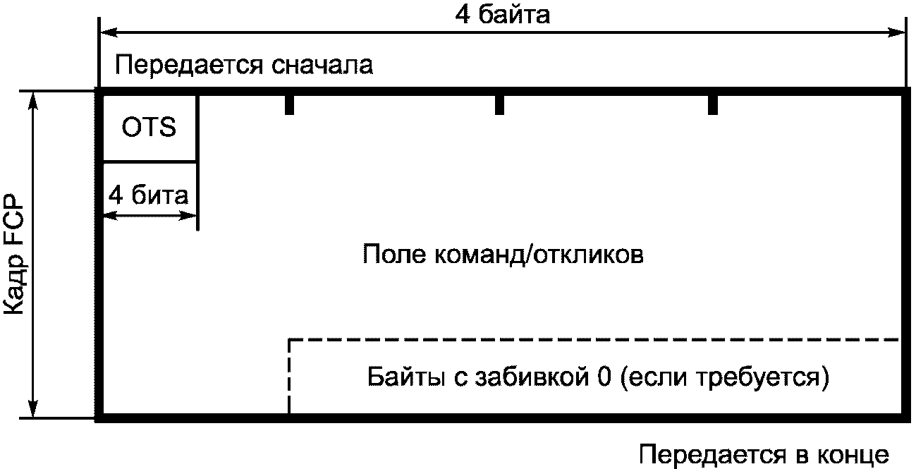 Набор команд/транзакций (CTS) - это один элемент кадра FCP. CTS определяет набор команд, структуру поля команд/откликов и правила транзакций, используемых для посылки команд и откликов. Кодировка CTS представлена в таблице 9.