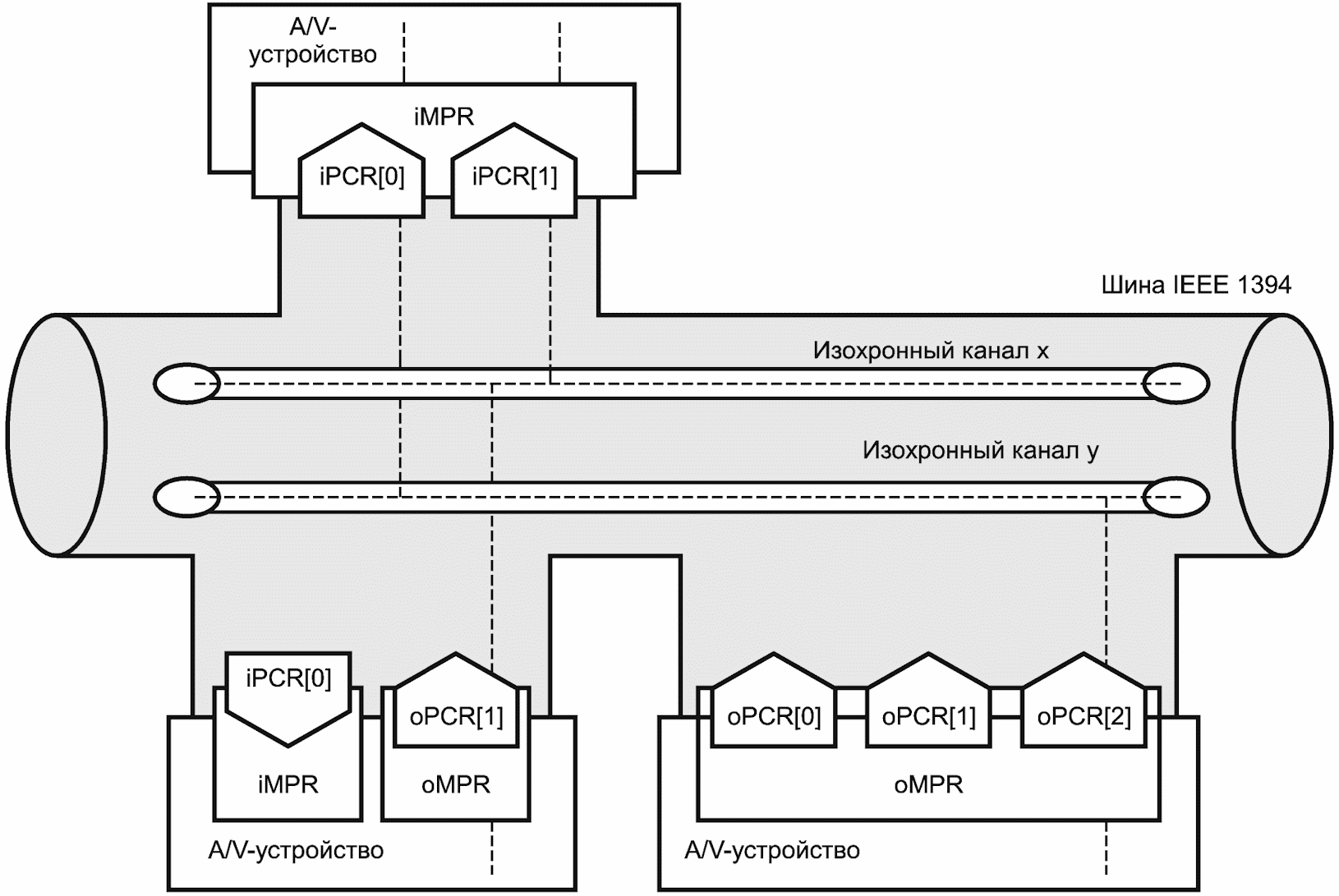 7.10). В этих процедурах для соединения должны использоваться тот канал и такая скорость передачи данных, которые были до перезапуска (обнуления) шины. На рисунке 25 представлены регистр управления разъемами и состояние потока изохронных данных после перезапуска (обнуления) шины.