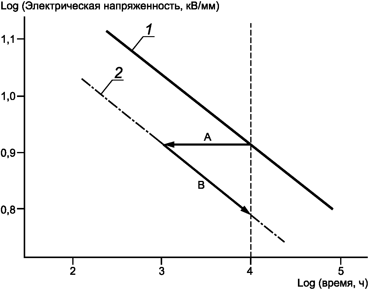 9.3. Значение коэффициента увеличения напряжения и срока службы при его выбранном относительном значении (обычно 50% от номинального) должны быть эквивалентны таковым для обычной изоляции, испытанной при частоте 50 или 60 Гц, что показало бы ее приемлемый срок службы. Эквивалентность предполагается при любом частичном перекрытии 90 процентных доверительных интервалов сроков службы и коэффициентов увеличения напряжения кривых сроков службы для испытуемого и референтного материалов для