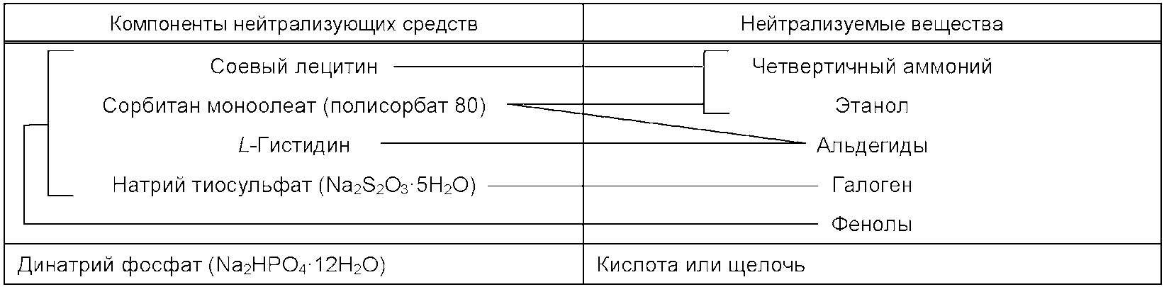 таблицу 1), не существует нейтрализующего средства, пригодного для всех случаев применения. Вместе с тем, если предполагают использование дезинфицирующего средства, состав которого не известен, используют нейтрализующее средство общего применения (см.