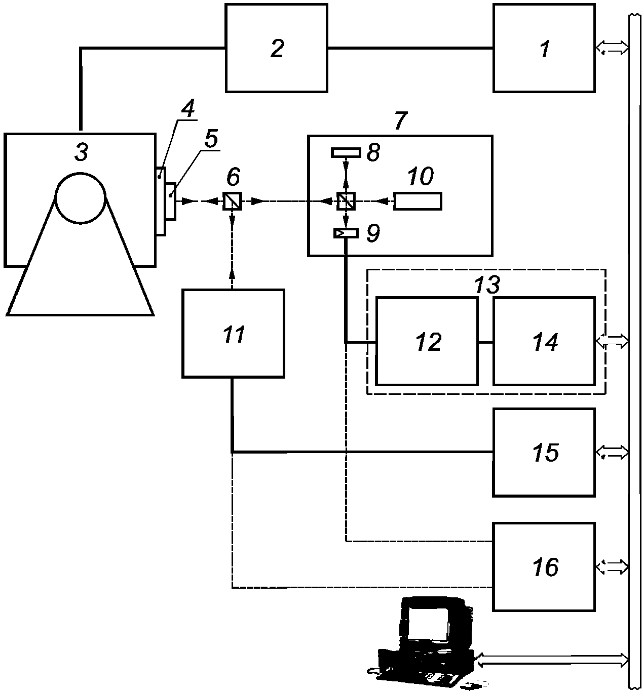 примечание 2) в сочетании с устройством для счета полос интерференционного сигнала. Принимая во внимание, что перемещение, соответствующее расстоянию между двумя полосами (максимумами или минимумами световой интенсивности), соответствует половине длины волны главных линий в спектре излучения неона в гелий-неоновом лазере, амплитуда перемещения может быть определена исходя из количества полос в течение заданного числа периодов (например, 1000) вибрации.