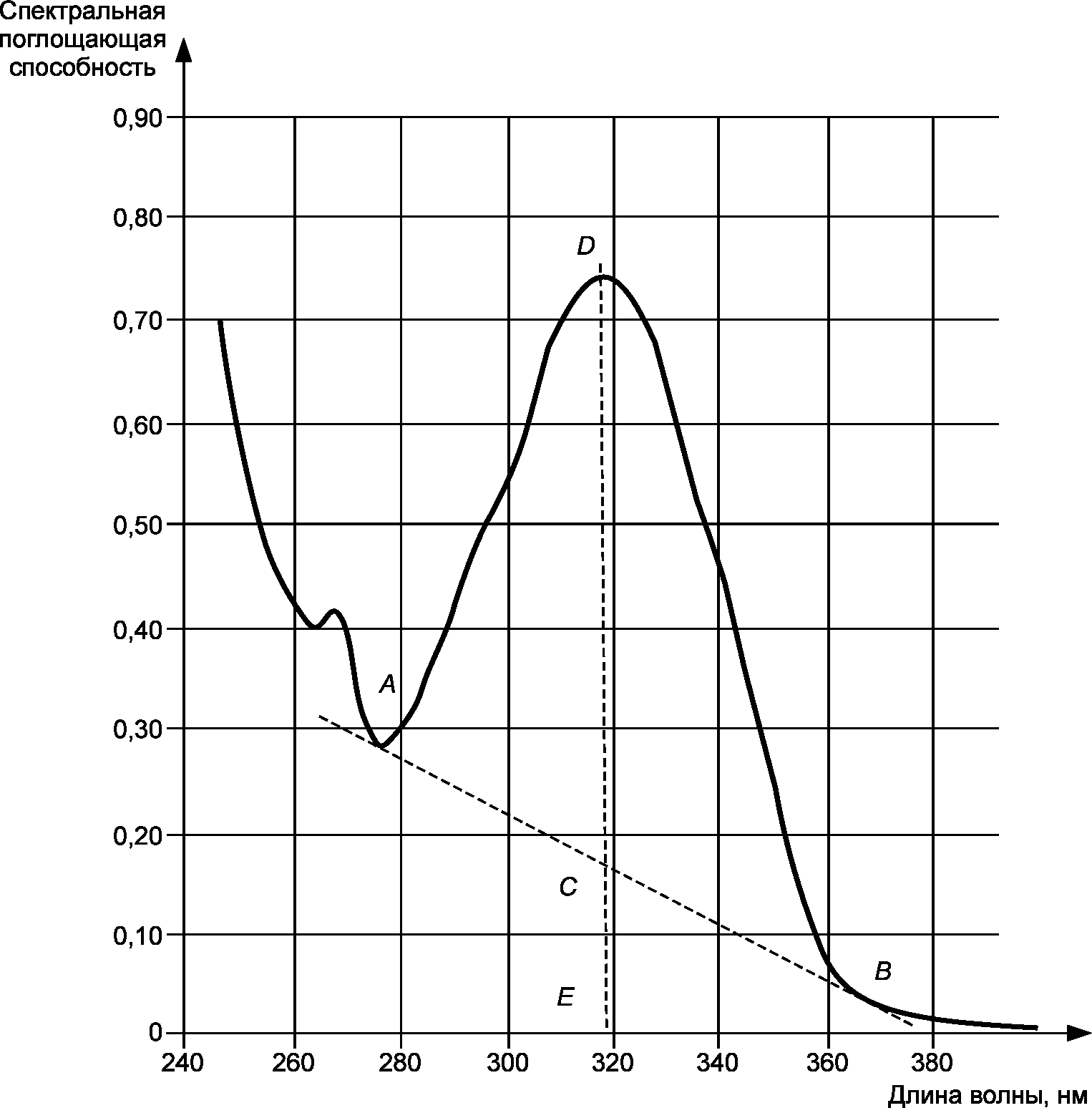 B), и линию, параллельную оси спектральной поглощающей способности, которая проходит через максимум поглощения (точка
