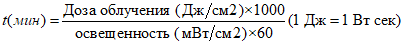 2.6 световая доза (Dose of light): Количество (интенсивность x время) ультрафиолетового (УФ) или видимого излучения, падающего на поверхность, и выраженная в Дж (Вт x с) на площадь поверхности, например: Дж/м2 и Дж/см2.