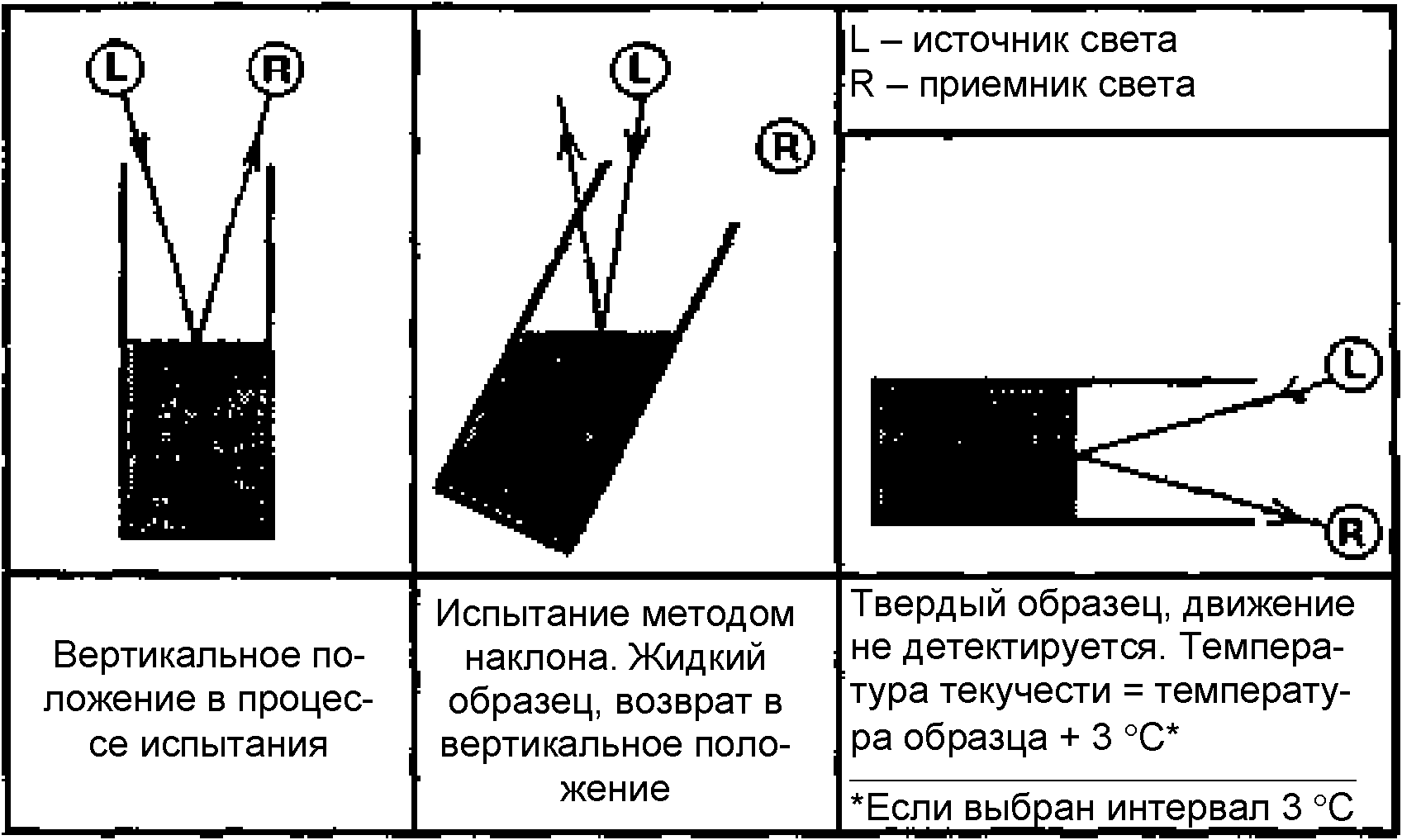 Когда испытательная пробирка наклоняется и удерживается в горизонтальном положении в течение 5 с без детектирования движения образца, регистрируется температура потери текучести и испытание завершается.
