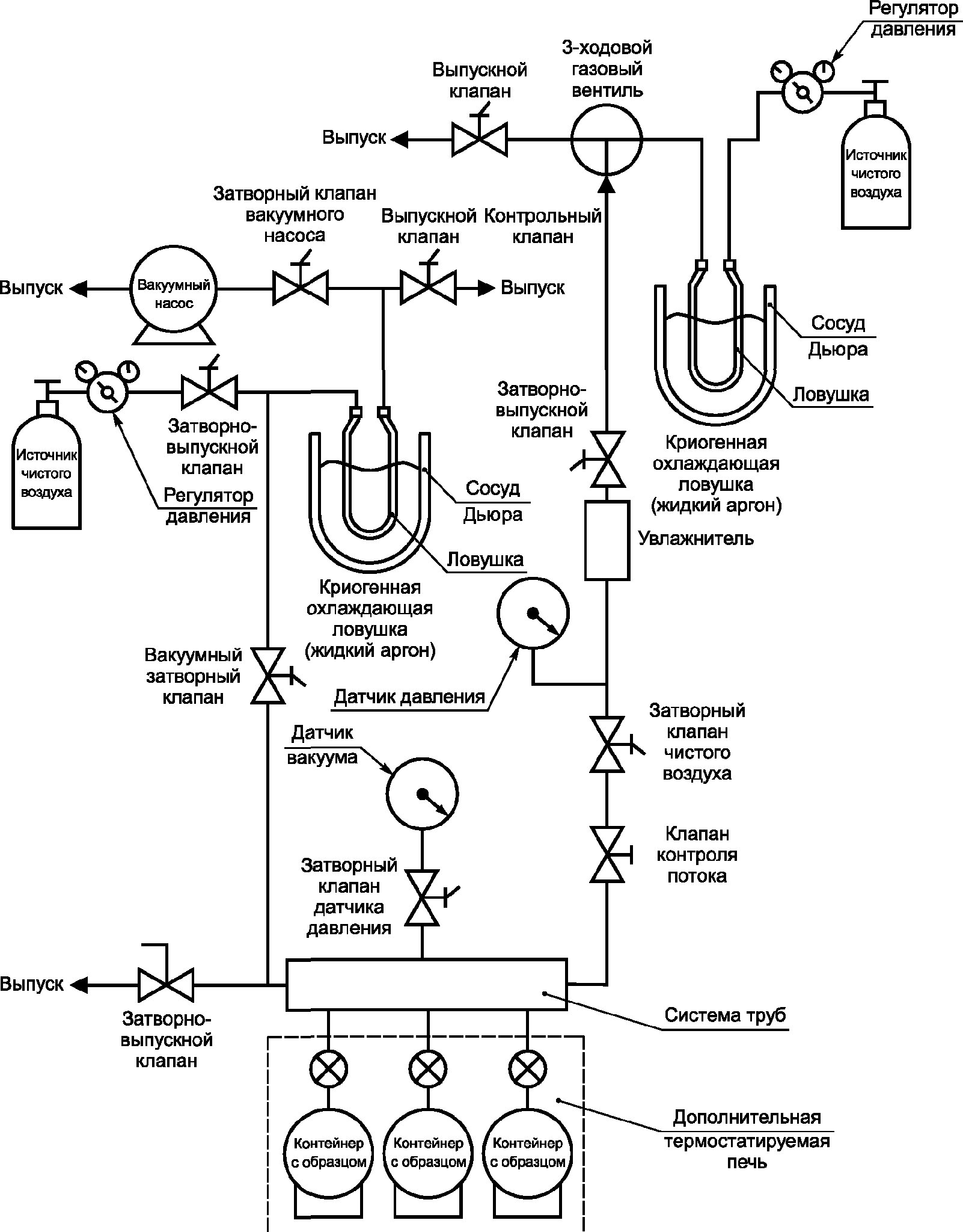 - контейнер для образца. Герметичный стальной сосуд необходимого объема (например, 6 л) под давлением, снабженный клапаном и особо приготовленной внутренней поверхностью. Ниже приведены коммерческие производители адсорбирующих контейнеров: