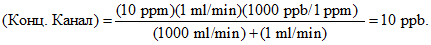 Например, при скорости потока 1 мл/мин стандарта концентрацией 10 ppmv, разбавленного потоком влажного воздуха скоростью 1000 мл/мин, конечная концентрация получается равной 10 ppbv.