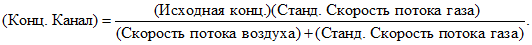 В качестве альтернативы аналитическая система может быть откалибрована путем отбора пробы прямо из системы каналов, если скорости потоков оптимизированы для обеспечения отбора желаемого количества калибровочных стандартов. Тем не менее использование контейнера в качестве резервуара до введения в систему концентрирования напоминает процедуру, обычно используемую для отбора образцов, и поэтому она более предпочтительна. Скорости потоков разбавляющего воздуха и первичного стандарта измеряют с помощью пузырькового измерителя или откалиброванного электронного измерителя потока. Концентрацию винилхлорида в системе каналов рассчитывают, используя соотношение при разбавлении и исходную концентрацию винилхлорида: