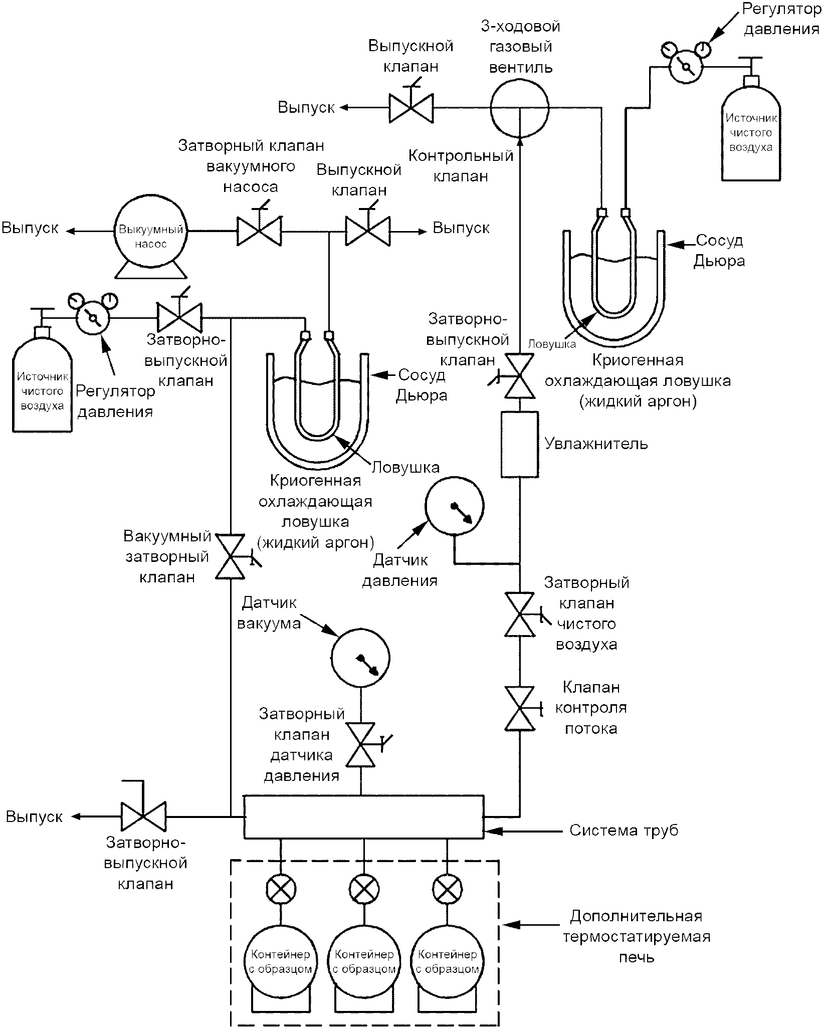 - датчик вакуум/давление. Необходимо два типа датчиков: один - для измерения вакуума (от минус 100 до 0 кПа или от 0 до минус 30 мм рт. ст.) и давления (от 0 до 206 кПа или от 0 до 30 пси) в системе пробоотбора; другой - для проверки вакуума в контейнере при очистке, способный измерять давление в области 0,05 мм рт. ст. с погрешностью не более 20%;
