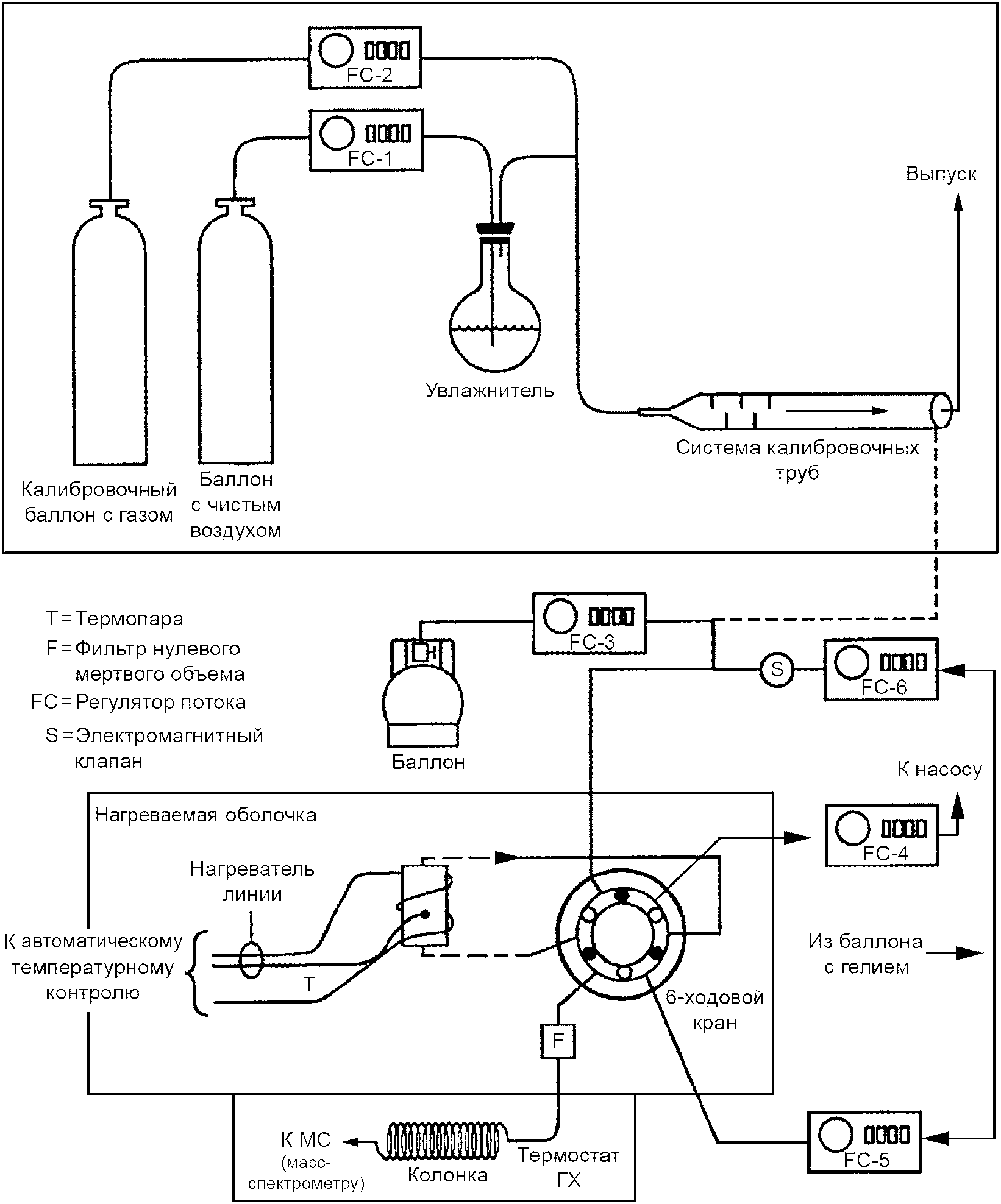Стандарты могут быть приготовлены динамическим разбавлением калибровочного стандарта из баллона с увлажненным чистым воздухом с помощью регулятора потока массы и калибровочной системы каналов. Рабочий стандарт может быть доставлен по системе каналов в чистый, вакуумированный контейнер с помощью насоса и регулятора потока массы.