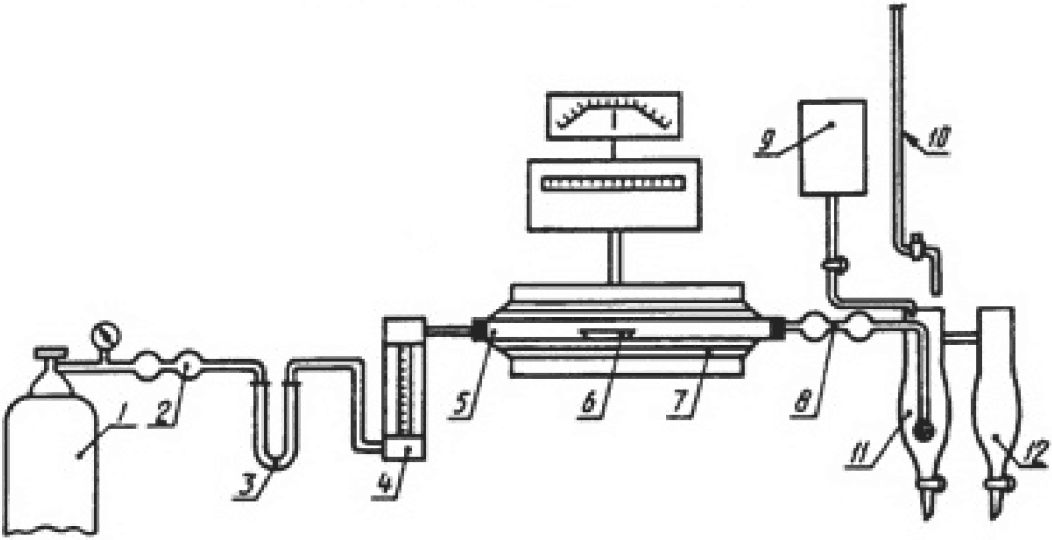 Лодочку с навеской и плавнем с помощью крючка помещают в горячую часть фарфоровой трубки, закрывают затвор и пропускают газ со скоростью от 2,5 до 3 дм3/мин.