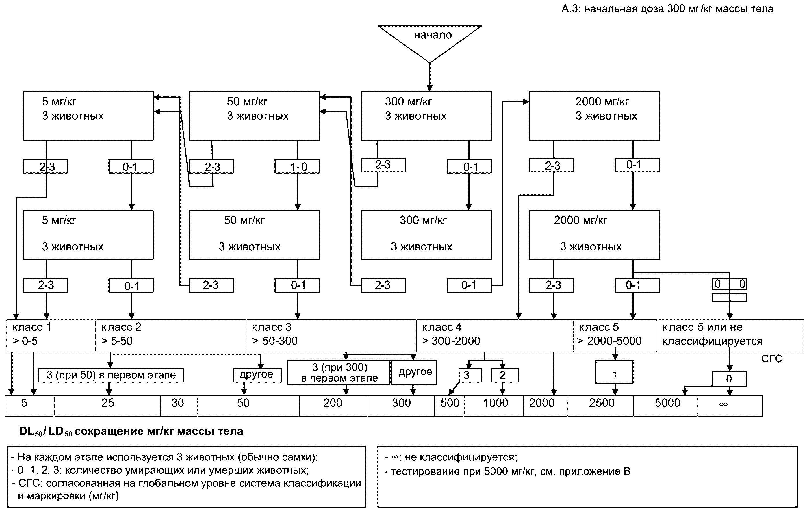 На каждом этапе используют трех животных. Уровень дозы, используемой как начальная доза, выбирается из одного из четырех фиксированных уровней: 5, 50, 300 и 2000 мг/кг массы тела. Уровень начальной дозы должен быть таким, чтобы с наибольшей вероятностью вызвать смерть некоторых из дозируемых животных. Блок-схема