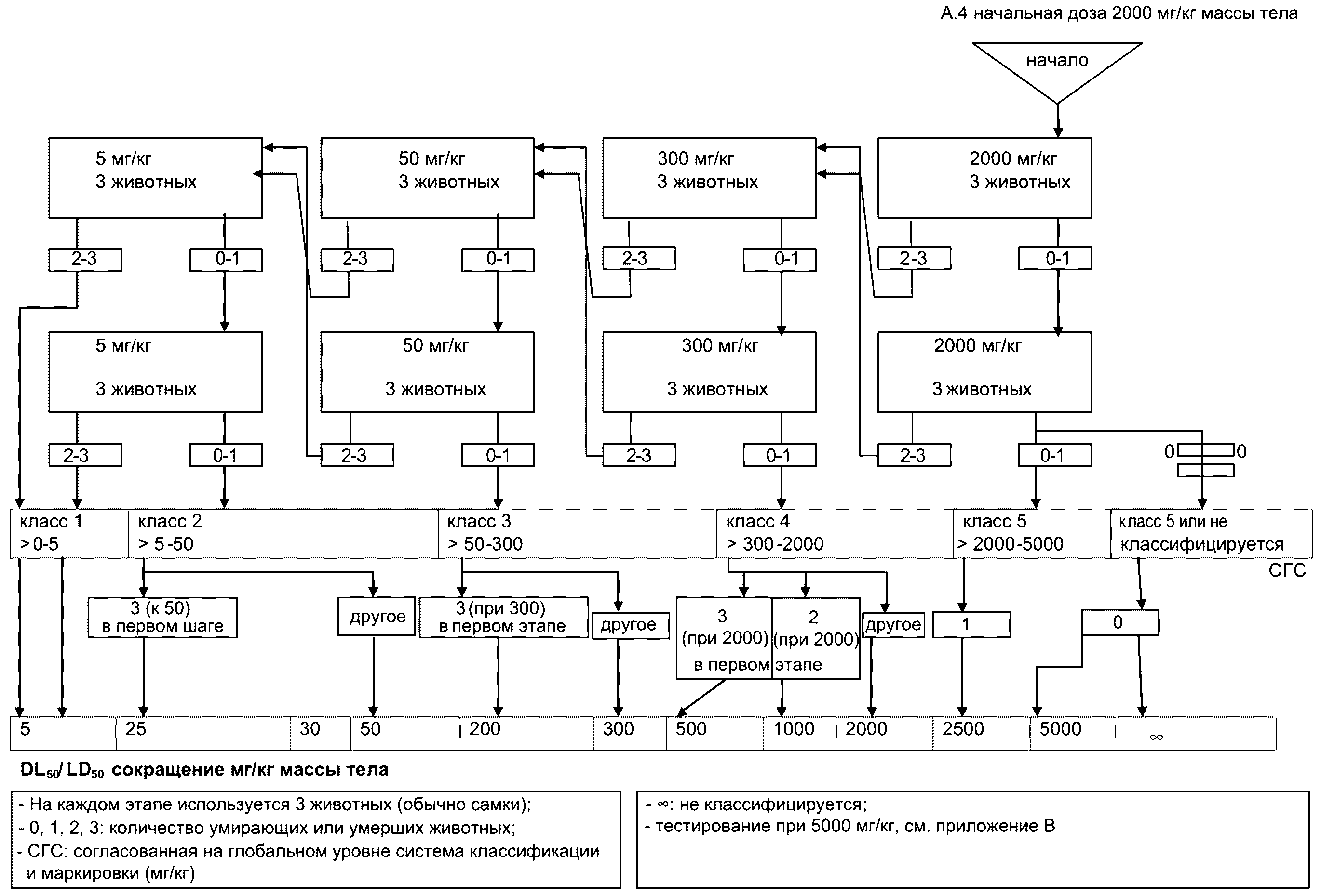 приложение B). Ввиду интересов благополучия животных их тестирование в диапазонах класса 5 (2000 - 5000 мг/кг) СГС не рекомендуется и должно рассматриваться только тогда, когда имеется большая вероятность, что результаты такого исследования имеют прямое отношение к защите здоровья человека или животных или окружающей среды.