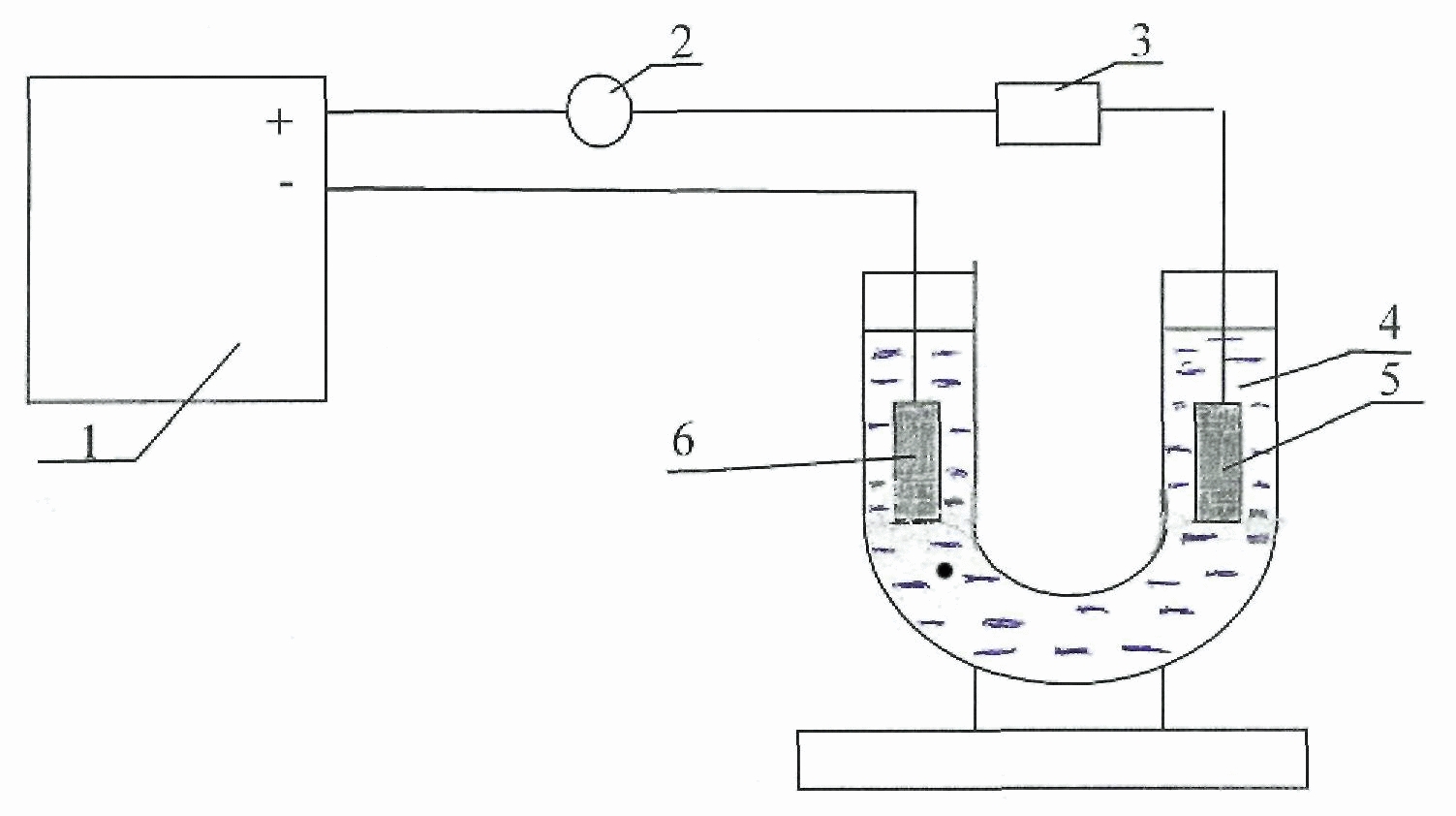 В стеклянный стакан объемом 500 см3, заполненный 1 М соляной кислотой HCl, помещают платиновый электрод (катод) и серебряный электрод (анод). Платиновый электрод подсоединяют к зажиму "+", серебряный электрод - к зажиму "-" блока питания. На блок питания подают ток 10 мА. Хлорирование проводят в течение 3 мин.