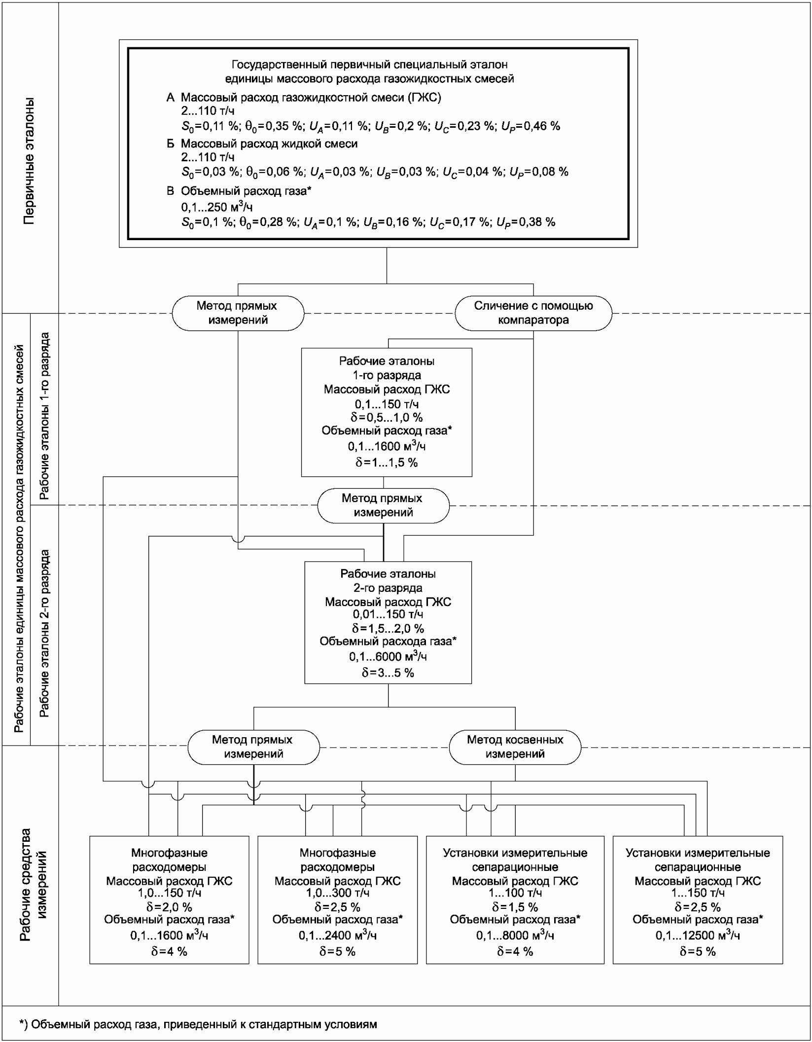 В качестве рабочих эталонов 1-го разряда применяют эталонные расходомерные установки газожидкостных смесей с диапазоном воспроизведения массового расхода газожидкостных смесей от 0,1 до 150 т/ч с относительной погрешностью от 0,5% до 1,0% и диапазоном воспроизведения объемного расхода газа, приведенного к стандартным условиям, от 0,1 до 1600 м3/ч с относительной погрешностью от 1,0% до 1,5%;