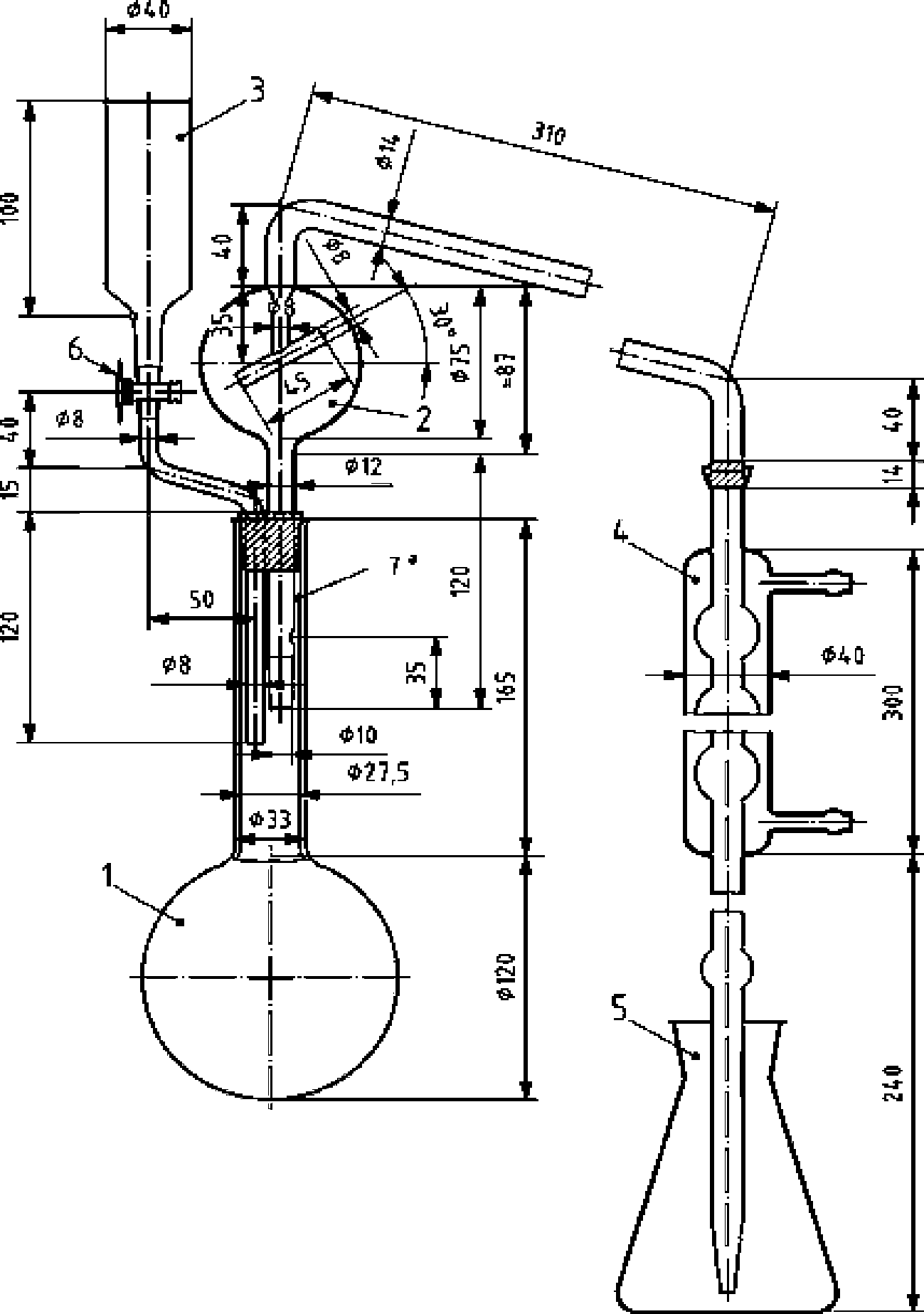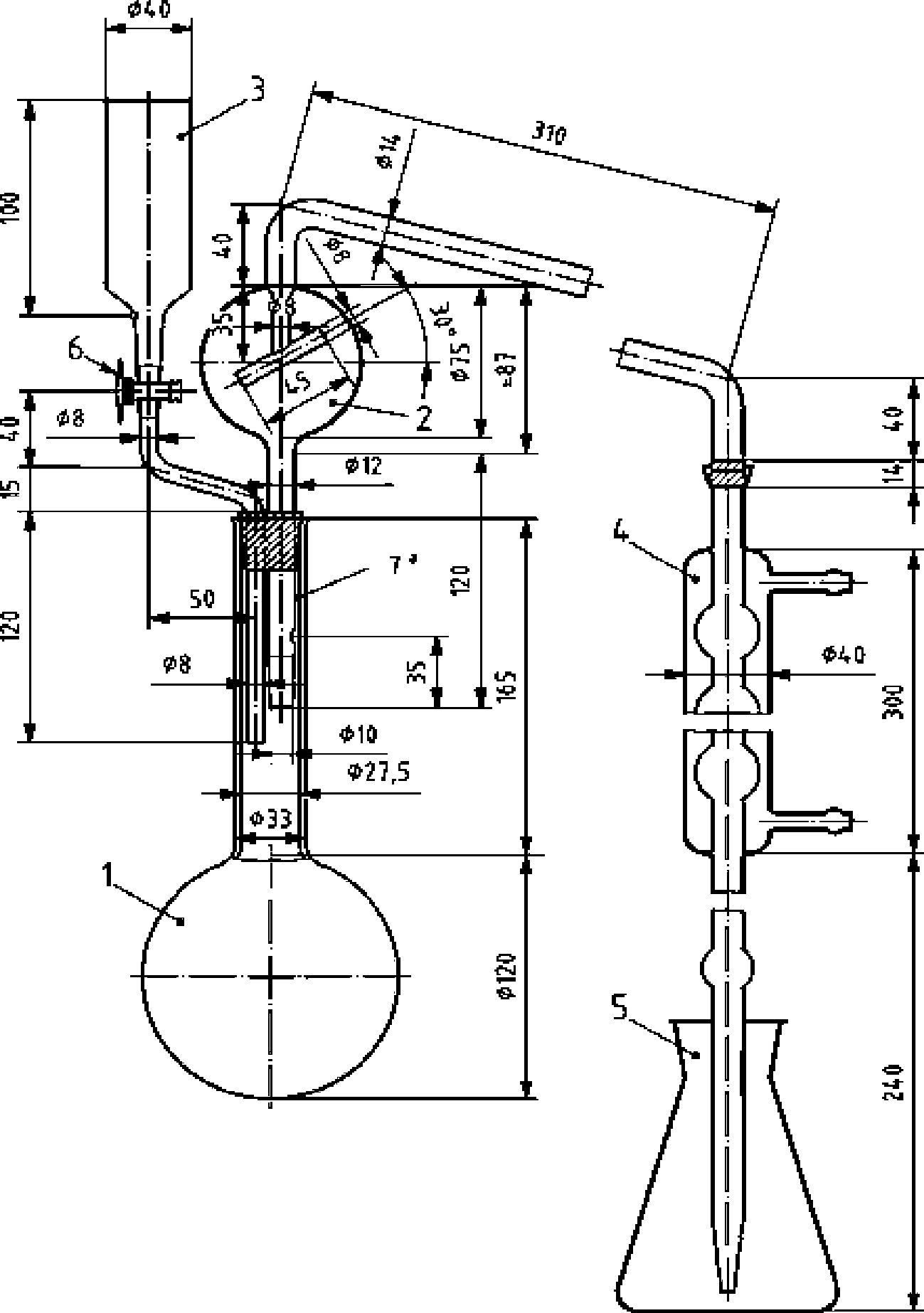 мл; 2 - дистилляционная трубка с насадкой, предохраняющей