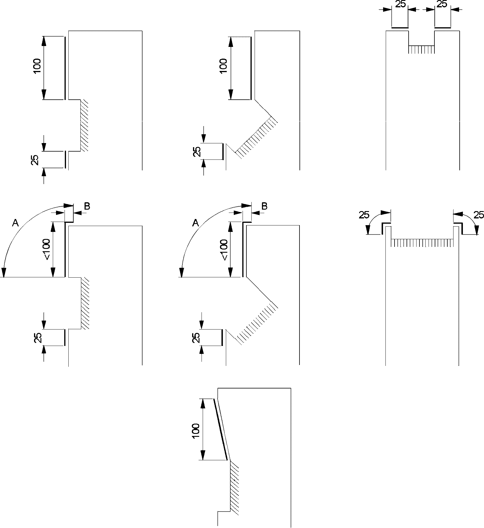 где: A - 100 мм максимум; B - 25 мм максимум