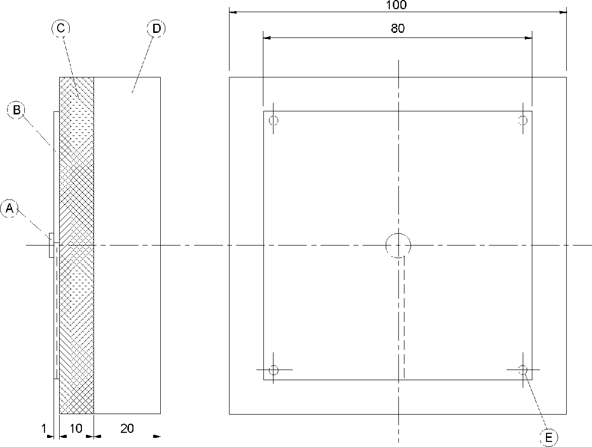 где: A - термопара крепится к центру медной пластины; B - квадратная медная пластина; C - теплоизоляционный материал; D - квадратный блок из древесины твердой породы; E - расположение крепежных отверстий