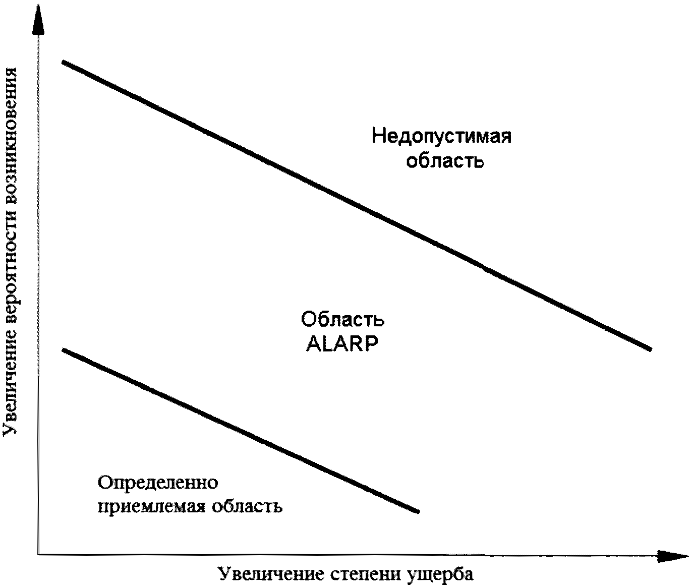 2) область РИСКА настолько мала, насколько это практически осуществимо (практически целесообразный достижимый уровень) (ALARP).