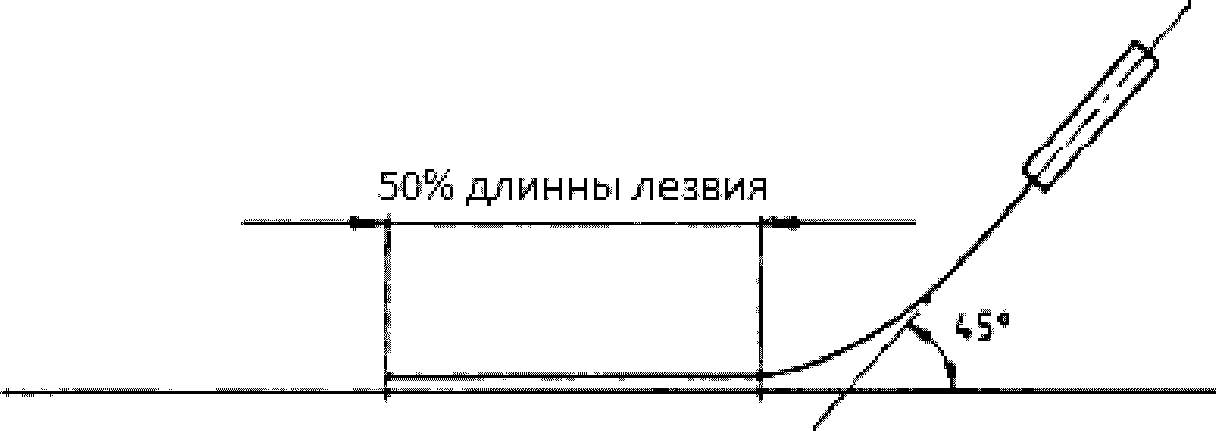 d) обратной стороной лезвия вертикально вниз.