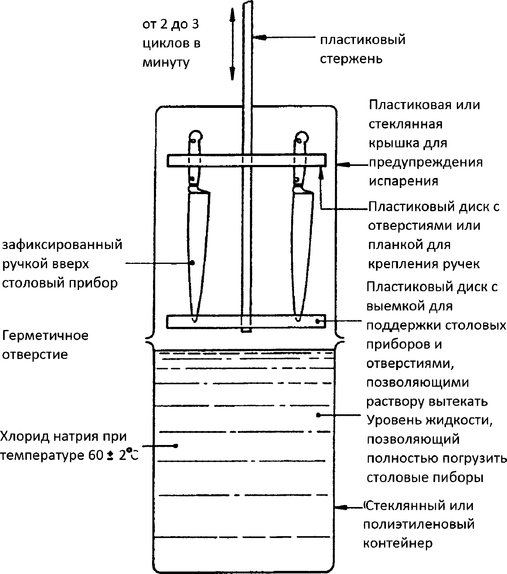 рисунке A.1. Устройство состоит из стеклянного или пластикового контейнера и стеклянного или пластикового покрытия, а также пластиковой стойки для образца, с приспособлением для подъема и спуска в контейнер.