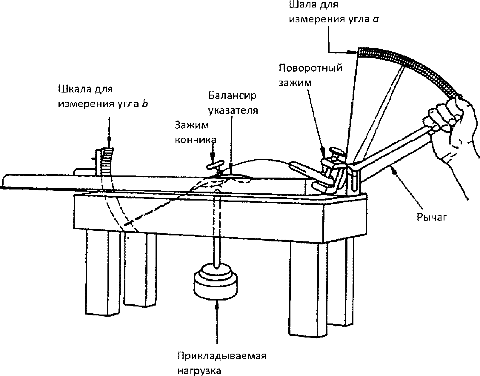 рисунке Г.1, не должен быть установлен до тех пор пока обе шкалы не установлены на нуль и должен быть удален до измерения угла остаточной деформации, в противном случае рычаг оказывает воздействие крутящим моментом на поворотный зажим, что приводит к ложным измерениям остаточной деформации.