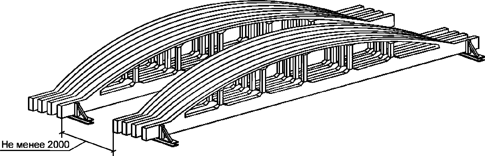 7.3 Подкладки следует устанавливать в соответствии со схемами (рисунок 1), приведенными в рабочих чертежах ферм. Расстояние между рядами ферм устанавливают с учетом возможности захвата каждой фермы при погрузочно-разгрузочных работах.