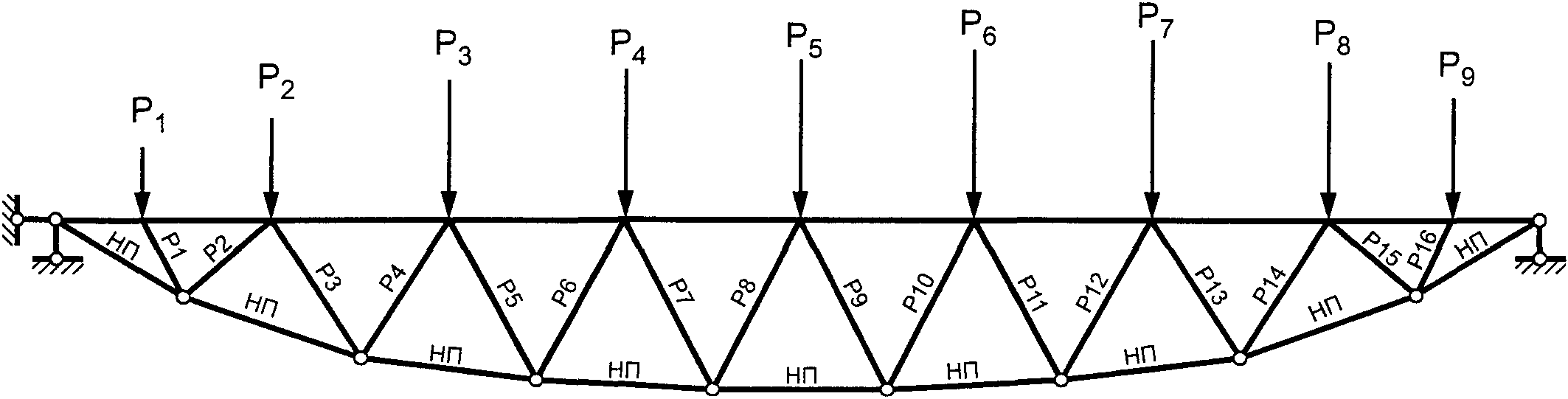 Ферма с удаленным наиболее напряженным раскосом | 1 | 2,76 | 2,87 | 2,77 | 2,89 | 2,77 | 2,89 | 2,78 | 2,89 | 2,77 | 2,88 |