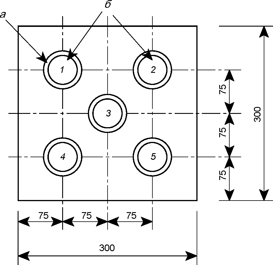 Д.3.4. После выдерживания по Д.3.3 на одной из граней заготовки сборного образца-плиты намечают места последующего бурения и испытания образцов-кернов, маркируя их согласно рисунку Д.4.
