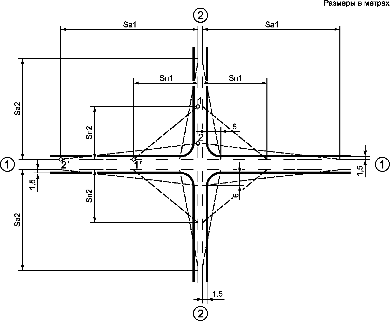 7.4.2 Точки установки вешек (1, 1' и 2, 2'), выбирают в соответствии с рисунком 4 исходя из нормативных значений расстояний видимости Si, установленных для пересекающихся дорог. Видимость считается обеспеченной, если первый наблюдатель с высоты 1 м видит объект видимости (расстояния Sпi) или перекладину вешки (расстояния Sаi) в месте нахождения второго наблюдателя.