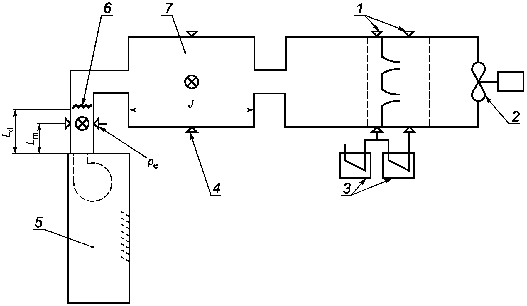П.3.2 Воздушный поток через теплообменник внутреннего блока должен быть создан отдельным вентилятором. Этот вентилятор должен быть расположен за теплообменником внутреннего блока, отверстиями на выпуске для измерения статического давления (см.