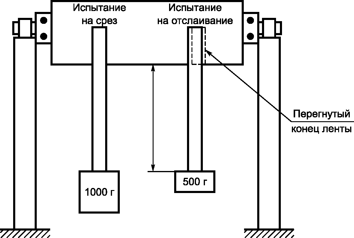 Испытание на отслаивание: наклеенную витражную ленту выдерживают в течение одного дня. Ленту обрезают так, чтобы 75 мм было приклеено к стеклу. Перегибают ленту. Подвешивают грузы по 500 г с двух сторон витражной ленты так, чтобы клеящий слой находился под воздействием растягивающей силы груза в 500 г, приложенной приблизительно на расстоянии 0,9 м. Оставляют груз не менее чем на 30 мин.