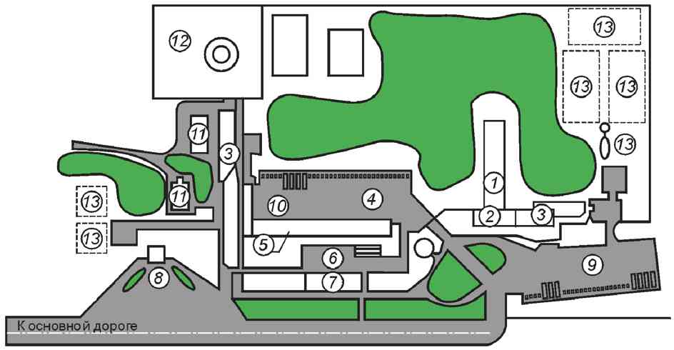 10 - котельная, прачечная; 11 - жилые дома персонала;