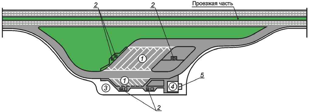 3.16 объекты дорожного сервиса: Здания и сооружения, расположенные в пределах полосы отвода и предназначенные для обслуживания участников дорожного движения (остановочные пункты автобусов, в том числе с павильонами, площадки для кратковременной остановки транспортных средств, площадки для отдыха со стоянками транспортных средств, устройства аварийно-вызывной связи и иные сооружения).