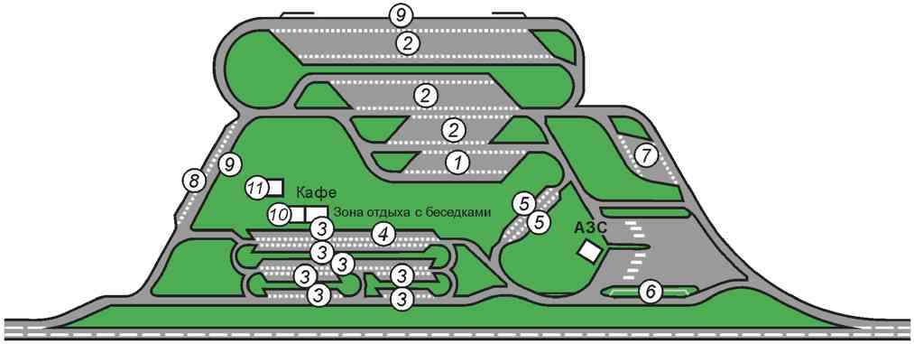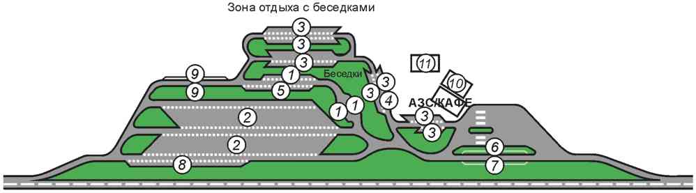 1 - грузовые автомобили/автобусы; 2 - стол со скамьями;