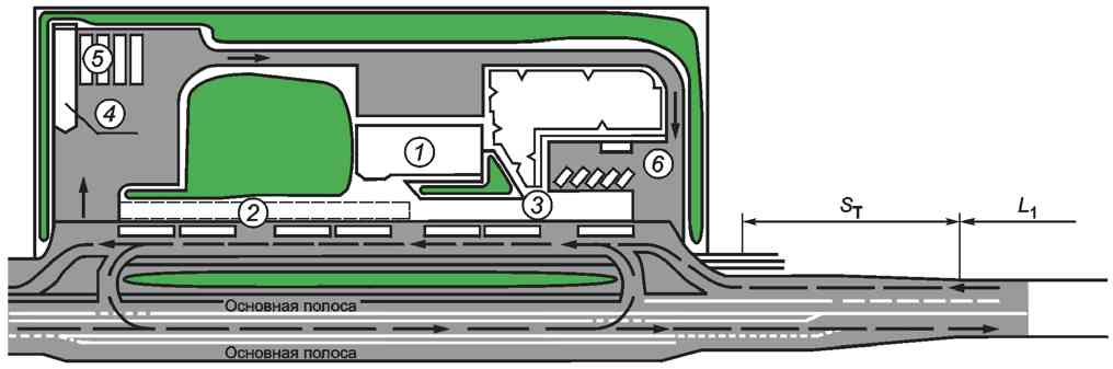 3.21 переходно-скоростные полосы: Дополнительные полосы движения, устраиваемые для обеспечения разгона и торможения транспортных средств, съезжающих с основных полос движения или въезжающих на них.