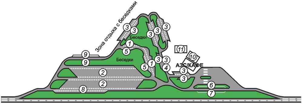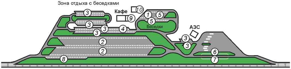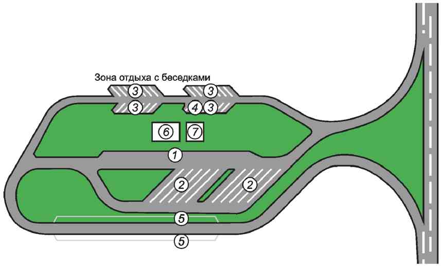 3 - благоустроенная зона отдыха; 4 - туалет;