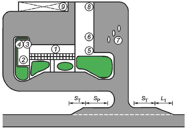 (продольная парковка); 9 - туалет; 10 - мусоросборник
