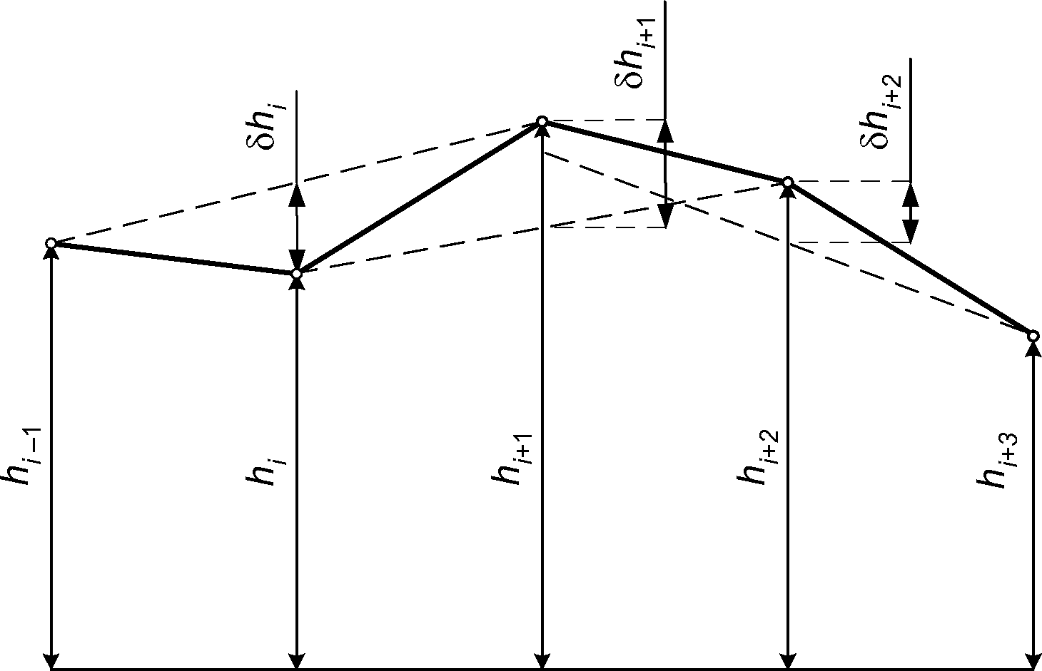 Е.2.1 Модуль разности вертикальных отметок необходимо определять как отклонение ординаты микропрофиля от прямой линии, проходящей через предыдущую и последующую точки массива ординат по формуле (Е.1).