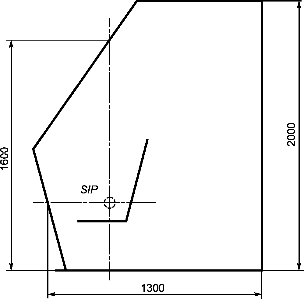 5.1.2 Внутренние размеры кабины должны быть не менее: высота - 2000 мм, ширина - 900 мм, длина - 1300 мм. В кабинах с невертикальной передней частью в сечении, проходящем через индексную точку сиденья оператора крана (крановщика) (SIP), допускается уменьшение высоты до 1600 мм (рисунок 1). Высота кабины грузовых тележек, передвигающихся по надземному крановому пути и предназначенных для работы сидя, может быть уменьшена до 1600 мм. В кабине должен быть обеспечен свободный доступ к расположенному в ней оборудованию. Размеры кабин отдельных типов кранов могут отличаться от требований настоящего стандарта и приведены в других его частях.