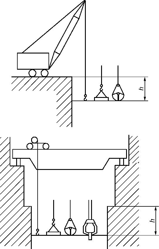 2.2.10 Глубина опускания h (E) Load-lowering height | Расстояние по вертикали от уровня стоянки крана до грузозахватного органа, находящегося в нижнем рабочем положении: для крюков - до нижней точки зева; для вил - до их рабочей поверхности; для прочих грузозахватных органов - до их нижней точки (в замкнутом положении). Для мостовых кранов глубина опускания принимается от уровня пола. Глубина опускания определяется без нагрузки при установке крана на горизонтальной площадке | ![]() |