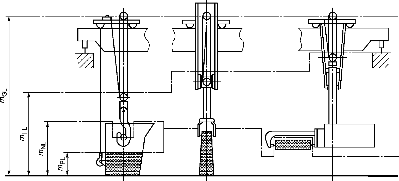2.2.9 Высота подъема H (E) Load-lifting height | Расстояние по вертикали от уровня стоянки до грузозахватного органа, находящегося в крайнем верхнем положении: для крюков - до нижней точки зева; для вил - до их рабочей поверхности; для прочих грузозахватных органов - до их нижней точки (в замкнутом положении). Примечание - Для мостовых кранов высота подъема принимается от уровня пола. Высота подъема определяется без нагрузки при установке крана на горизонтальной площадке | ![]() |