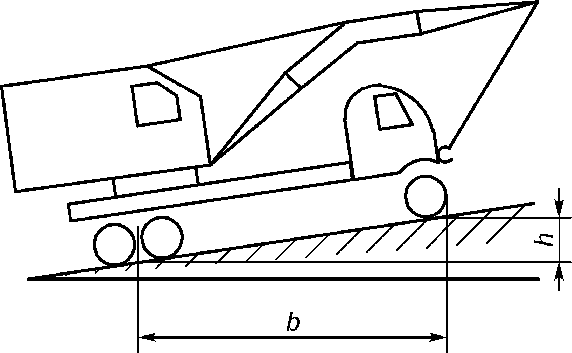 2.4.8 Уклон пути i (E) Gradient | Уклон, на котором допускается работа крана, определяют отношением i = h/b, выраженным в процентах, соответствующим разности уровней двух точек пути, находящихся на расстоянии b, равном базе крана. Примечание - Значение разности уровней измеряется при отсутствии нагрузки на данный участок пути. | ![]() |