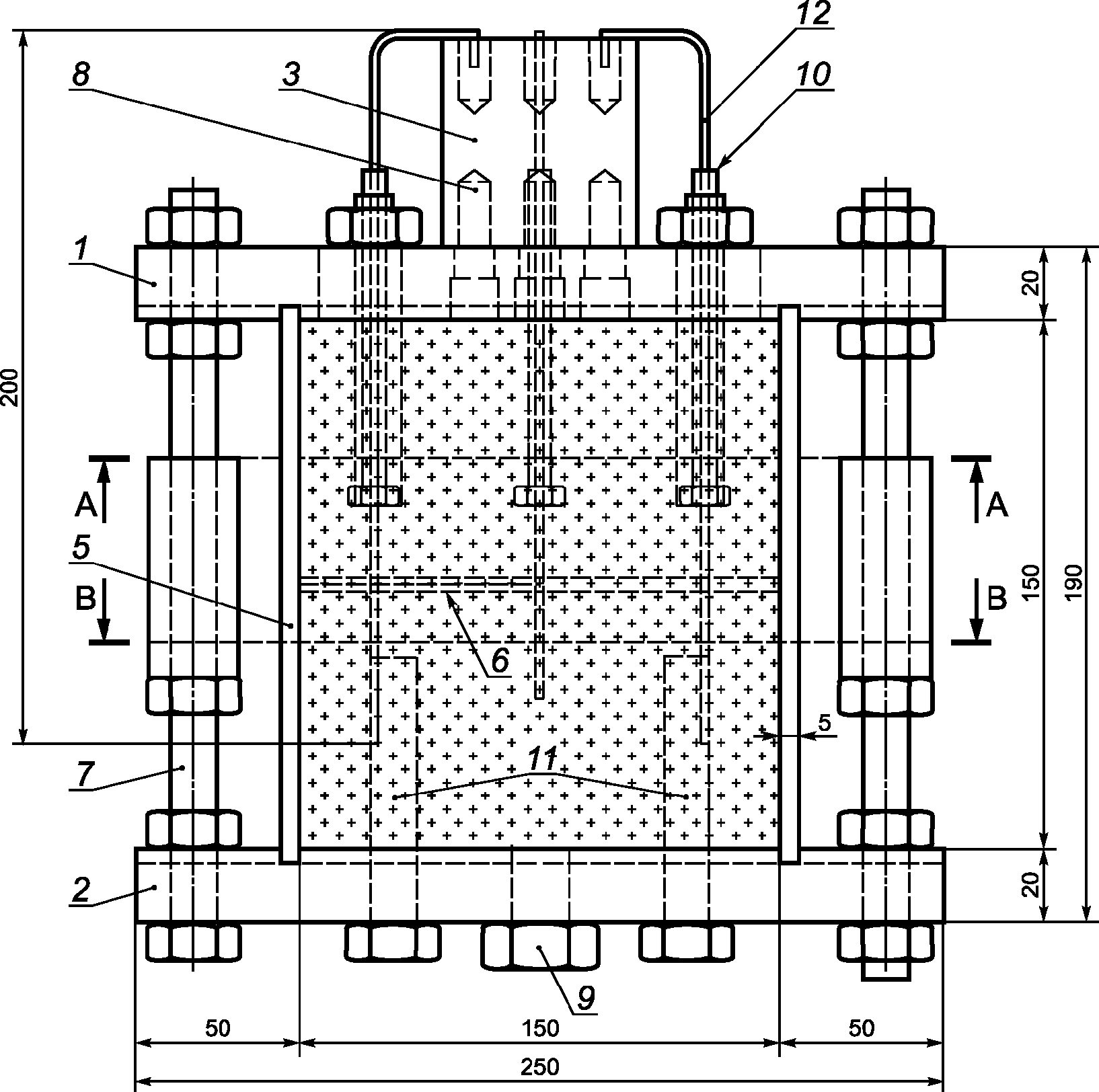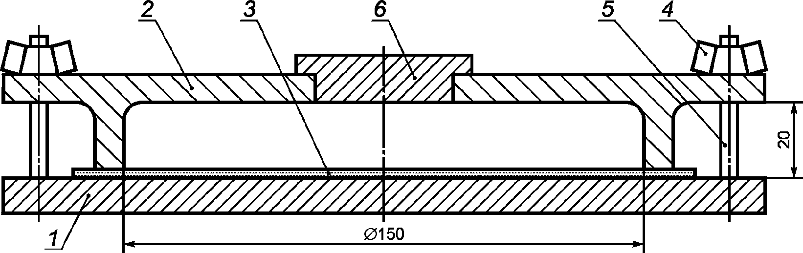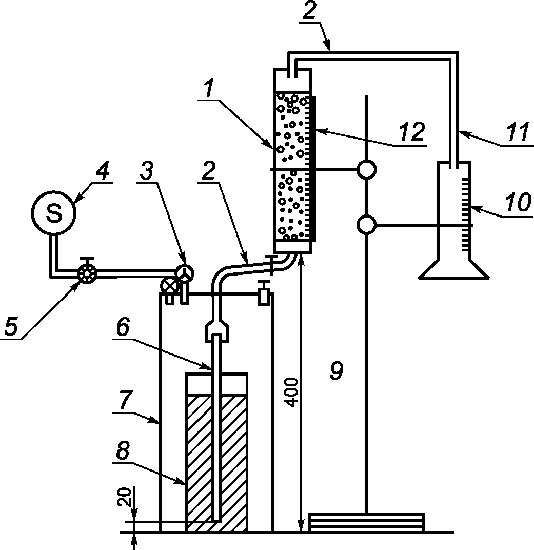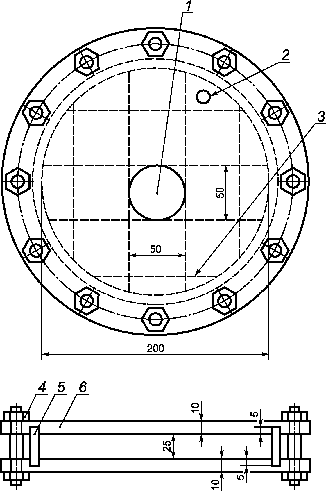 рисунок У.1). Рама состоит из плиты основания и открытой по концам камеры диаметром 150 мм, в которой плотно зажимают образцы с помощью навинченных на болты гаек-барашков. Во время испытания верхнее отверстие камеры плотно закрывают подходящей пробкой.