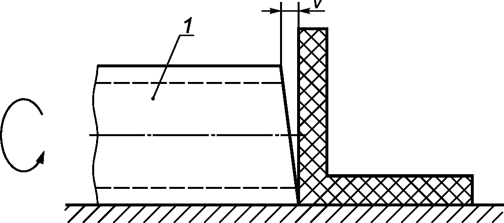 рисунок 4). Отклонение от прямоугольности v определяют как максимальное расстояние от верхнего среза цилиндра до металлического уголка. Измерение проводят металлической рулеткой, поворачивая цилиндр вокруг своей оси до тех пор, пока не определена точка, в которой расстояние между металлическим уголком и цилиндром максимальное. Измерения проводят по обоим торцам цилиндра.